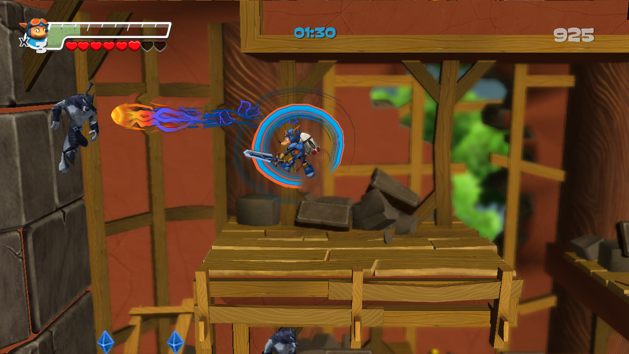 In Rocket Knight, players control Sparkster, who returns home to The Kingdom of Zephyrus after 15 years only to find it in shambles. Using wits and a trusty rocket pack, players must steer clear and overcome a hostile wolf army looming to take the lives of the Zephyrus people. A 2.5D action adventure title, Rocket Knight brings expansive new worlds, each with massive platform levels and a rocket flying level.
