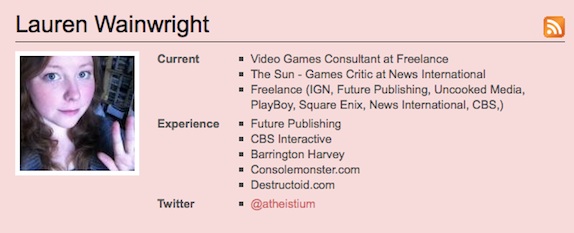 But now it turns out that there’s even another layer to the story that makes it all the more sinister. Florence was simply using Lauren as an example as she seemed to be over-enthusiastic about the Square Enix-published TR. What he didn’t know/mention at the time was the Wainwright has worked for Square Enix. As discovered by Twitterers and covered in an excellent Penny Arcade article, she works (or worked, it is unclear) for Square Enix, something she has now removed from Journalisted: