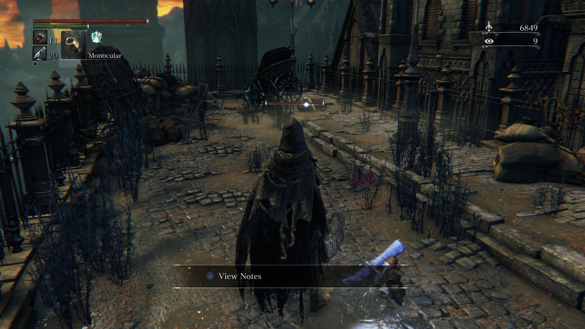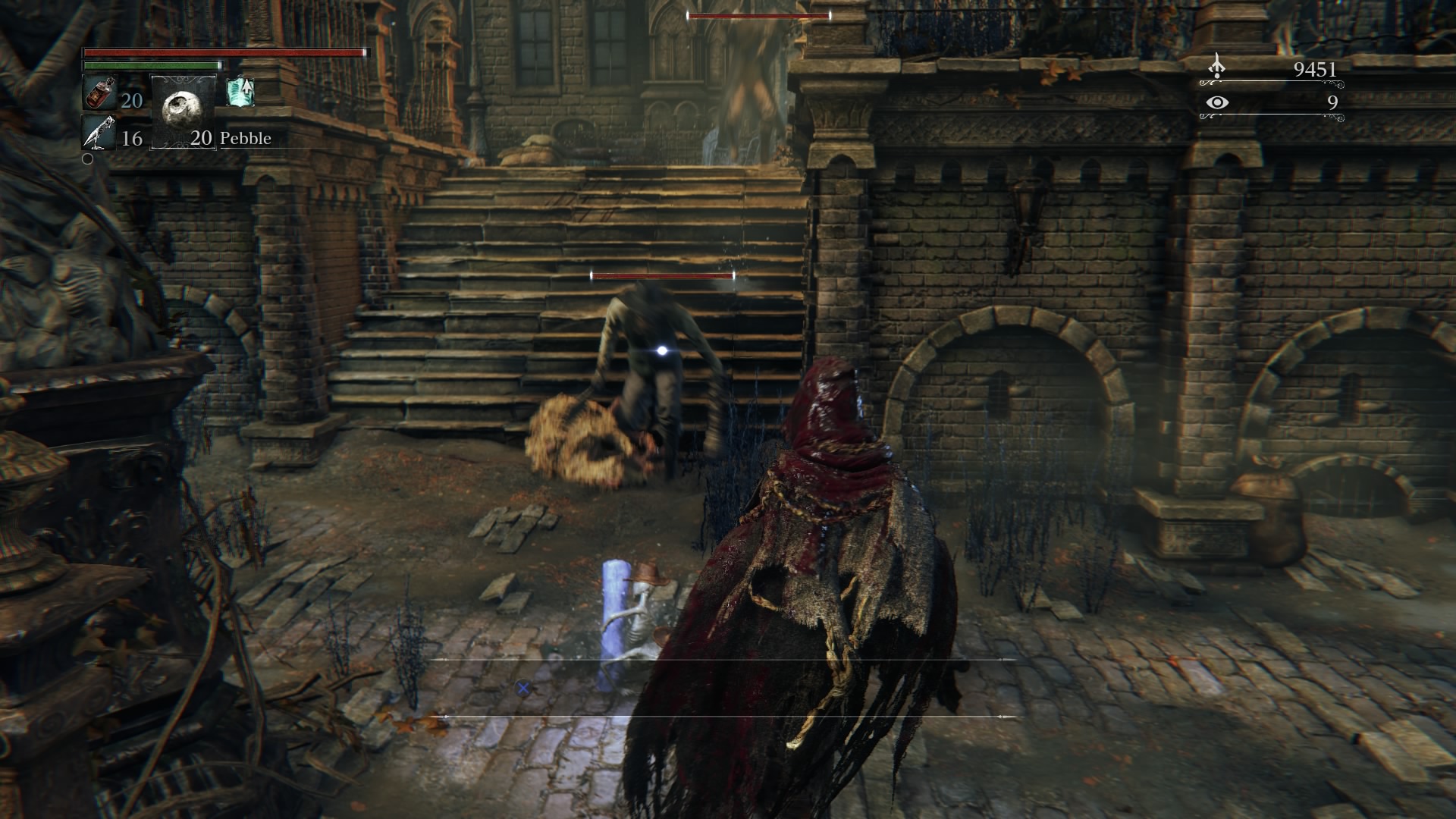 It’s time for another sleeping enemy. Once you run past the flaming cross to your left and a carriage to your right, you might miss the enemy that is sleeping in front of some stairs. Use his laziness to your advantage, and hit him with R2 before he sees it coming. Since it’s early in the game you’ll likely have to follow this up with an R1 attack. Head up the stairs. To your right, you’ll see some more stairs. Walk up the left side of them, and a hidden enemy will make his presence known. Take him out with an R2 attack as well. Collect any items his corpse leaves behind, and head back down. Right of the stairs is a lamppost. Once you get to it, another lazily-hidden enemy is waiting. So dispatch him with a quick press of R2 as well.