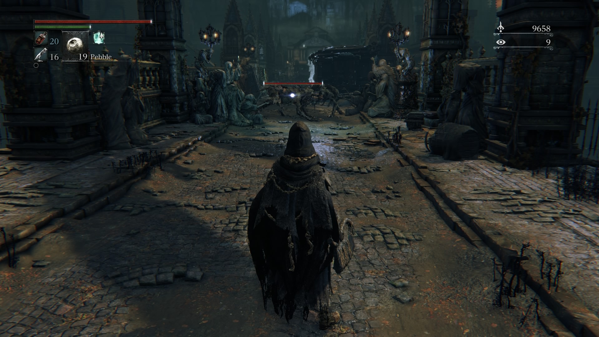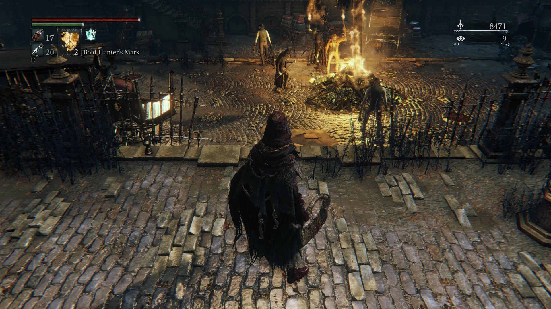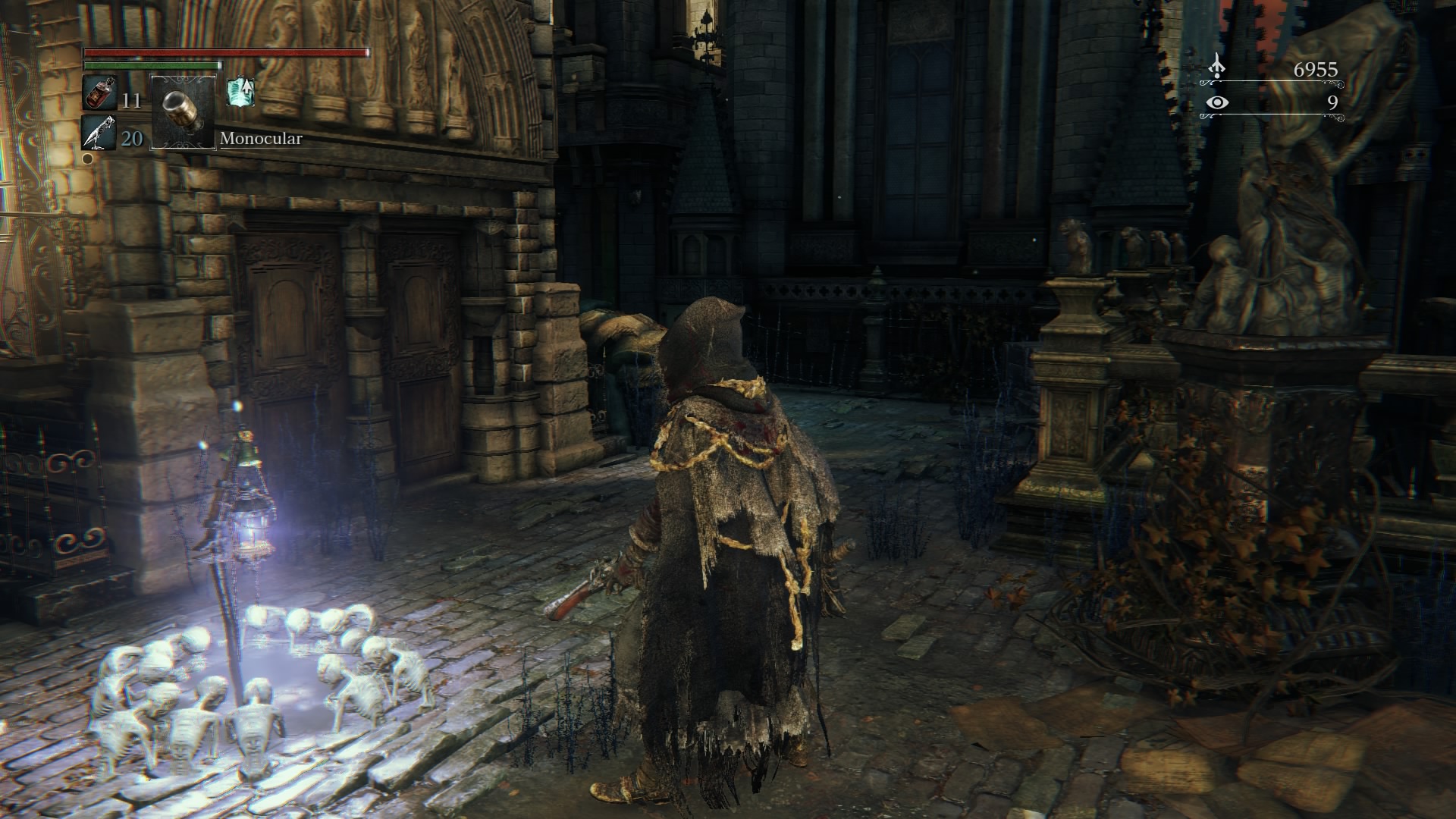 If you haven’t cashed in any Blood Echoes by this point, you’ll want to. Go ahead and go back the way you came, through the hallway, and back to either lantern that you’ve lit so far. I say this because if you haven’t gone back to the Hunter’s Dream and at least bought some of the new equipment that has been unlocked so far, you probably won’t survive this next encounter, and run the risk of losing what no doubt is a hefty amount of Blood Echoes by this point.