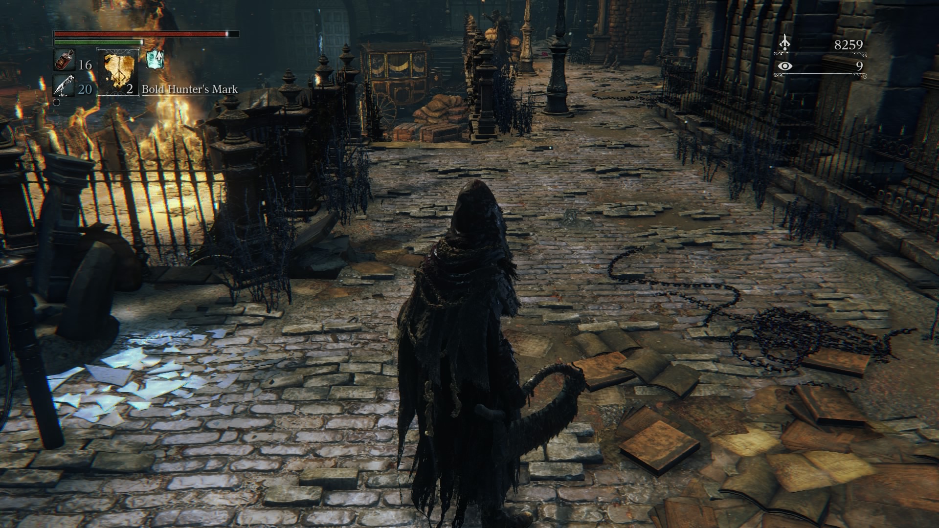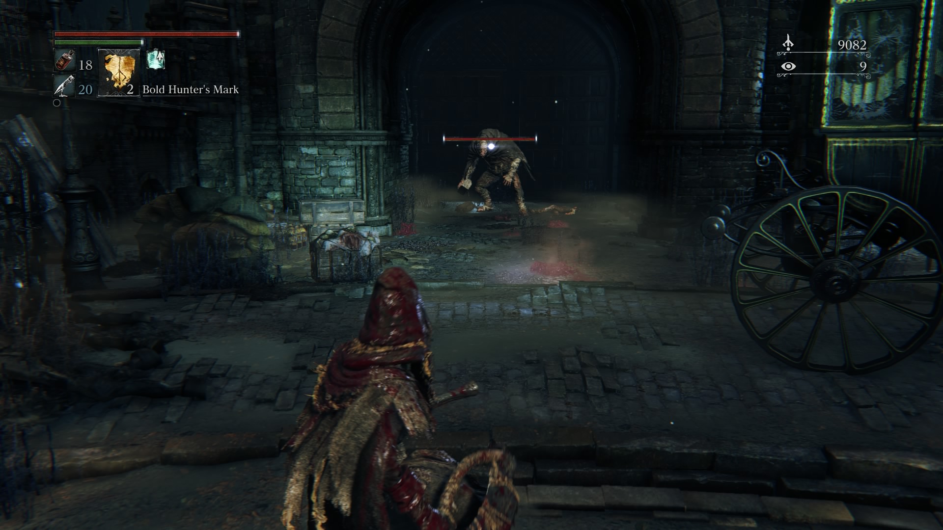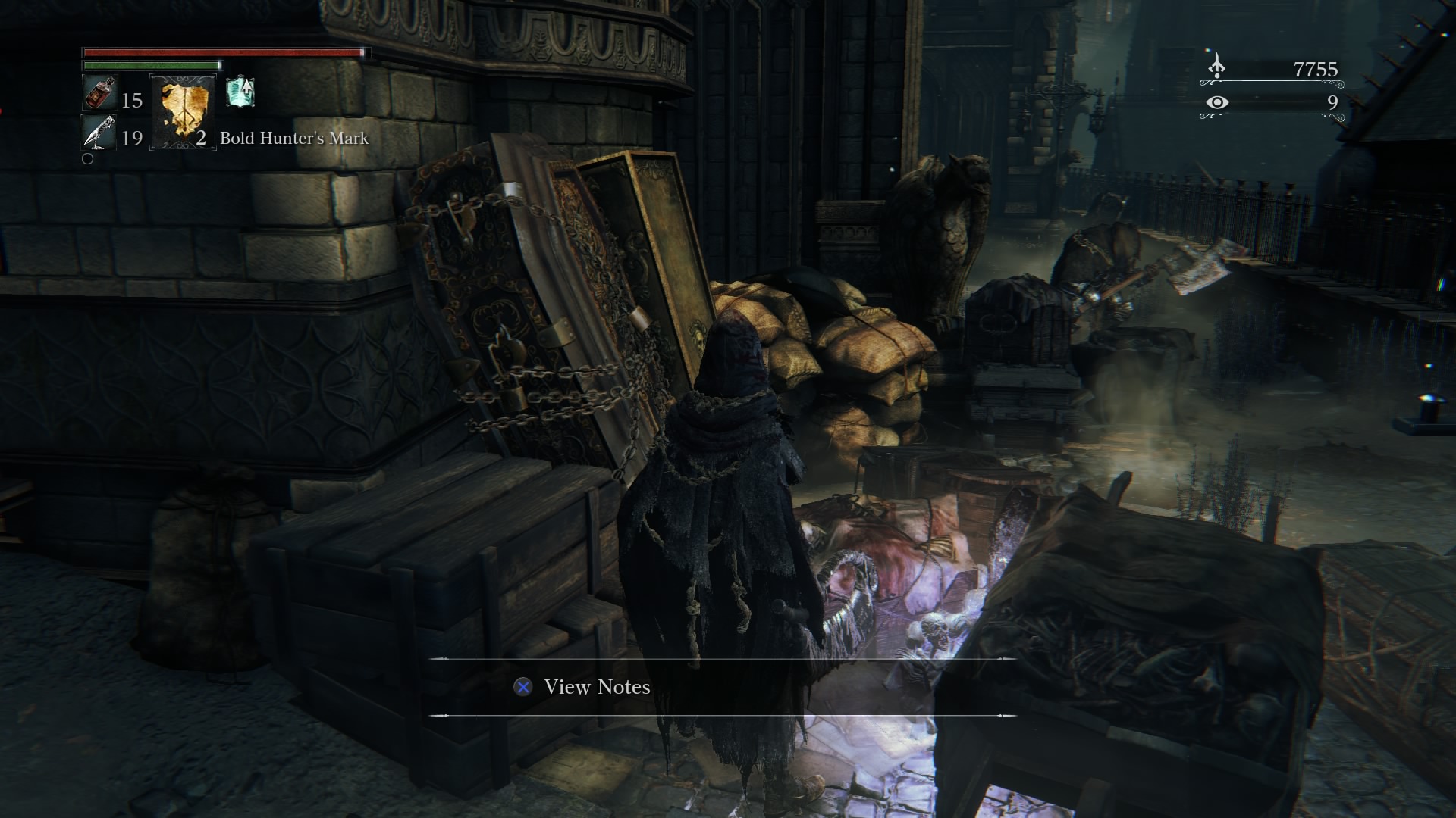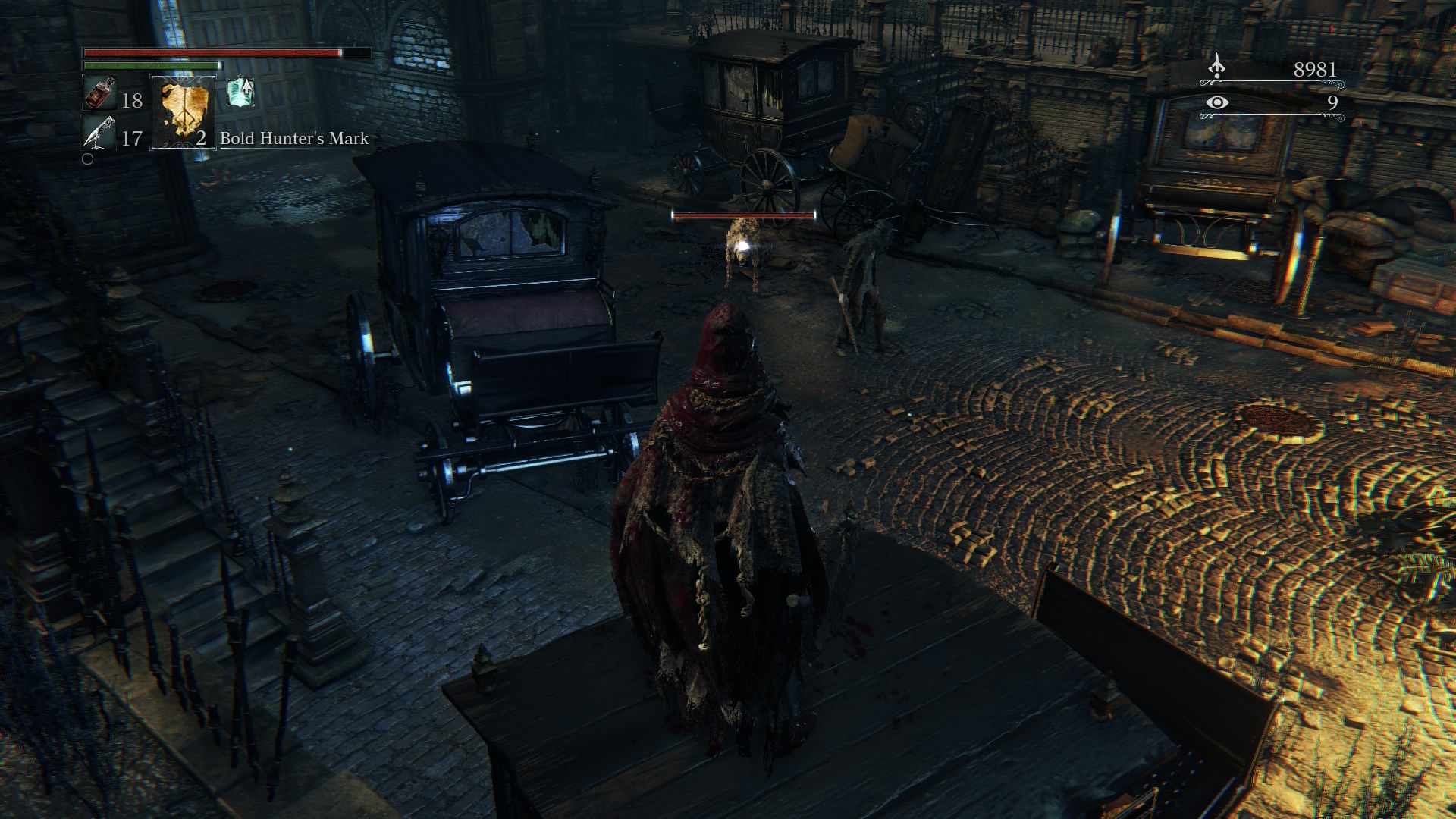 You can head down the stairs and turn left, but only after you’re used to the game’s mechanics. After walking down the path for a while, you’ll hear that shuffling you heard a few moments ago. Turn left at the end of the alley, and you’ll see a sword-wielding gentleman I refer to as “Bubba.” Bubba is a very powerful enemy for beginners. He has a simple back-and-forth route, and when his back is turned you’ll want to clear out the debris between him and you. When you’re ready, target him and make sure you’ve always got him in your sights. There is no sneaking up on him, so try to get in a good first attack. You’ll probably find more success keeping your weapon in close-range mode, because he’s too quick for your charged up or ranged attacks. After you hit him no more than twice in a row, immediately backstep out to dodge his incoming attack. Try to lure him out into a more open area for your best chance at survival. Wait for his next attack, which is hopefully a lunge, and sidestep it. Immediately run towards him as he finishes collecting himself, and go for as many quick R1 attacks as you can manage, three at most. Dodge back, and wait for his next attack. Don’t get too far away from him, otherwise you run the risk of no longer targeting him while he can still see you. This is when he’ll likely use a jump attack that is very powerful and hard to dodge. With patience and practice you can take him relatively easily. He’s mostly here as a stash of Blood Echoes to collect, since he’s not guarding anything particularly valuable. Head back up the alleyway to continue.