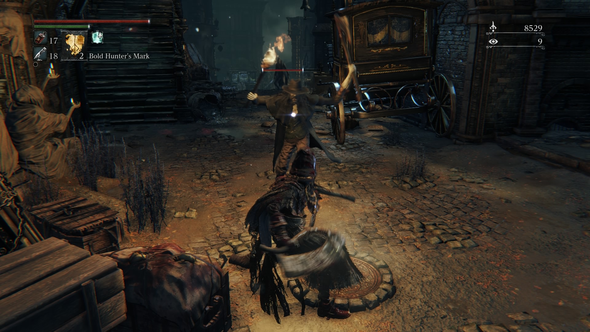 By this point, there should be four villagers left around the fire that you can take out separately, not including the gun enemies. Head towards the fire, but stop along the side of the left staircase. If you stay out towards the middle of the street, two of the roaming enemies up top should see you and start to move towards you. If not, lure them towards you by shooting them. Be careful though – the rifleman up top can see you for quite some distance, so you’ll likely want to backstep and take out enemies from some distance away from him. Your gun is too weak at this point to do any real damage to him, so run up the stairs, wait until he fires, then lunge at him with R2 followed up by R1 if needed. Stay on top of his stagecoach, and you’ll hear some barking. It’s an undead dog. There’s likely still a gunman below, but most of the time he’s seemingly blind and won’t see you.