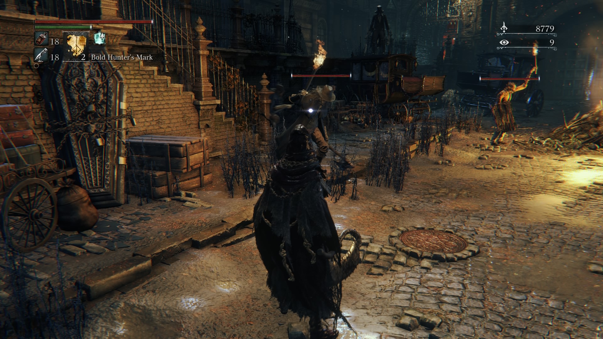 The right gate will be locked, so head left and open up to your first glimpse of Central Yharnam. You’re relatively safe here, but when you head up to the right you’ll want to hang left. There you’ll find one enemy prowling around, with a torch and blade. Walk up quickly, and start with a heavy attack (R2). Keep along that path and you’ll find two sleeping enemies. Take the one out on the right first, and then the left, before they finish their animations, and you should remain untouched.