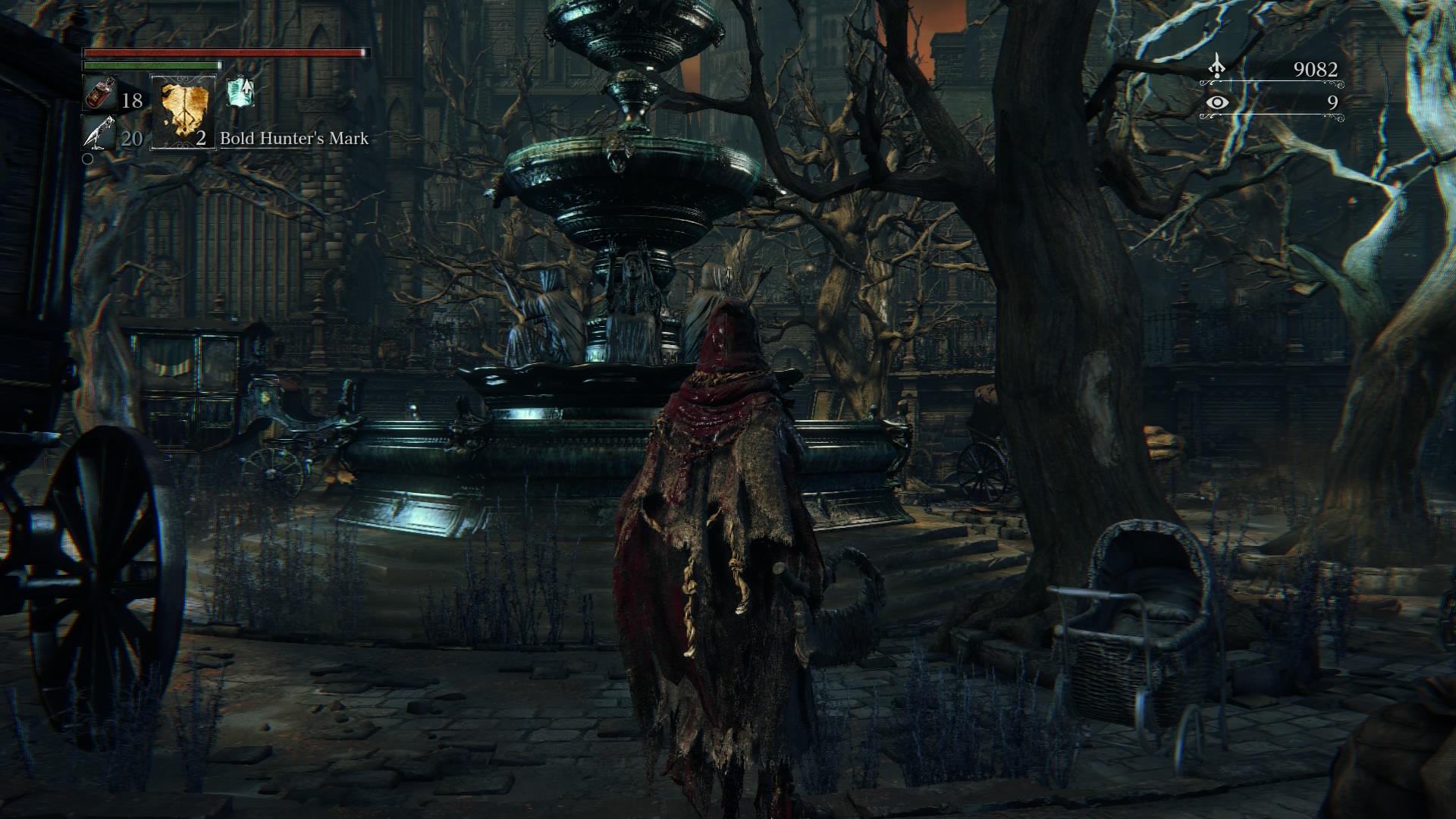 If you head back to the other side of the fountain, you’ll see some decrepit stagecoaches and a pile of undead crows. They’re pretty easily dealt with using R1. Collect any goodies they leave behind, don’t forget to check under and around the coffins, and heal if you’re hurt at all! Now head up the stairs opposite where you came from.