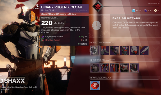- Vendor Gear Purchase – Armor will be made available to purchase from the different factions using Legendary Shards and the appropriate Tokens. Weapons will be available, but will rotate. Purchasable armor slots are unlocked by gaining reward engrams, with the game recognizing previous engrams claimed.