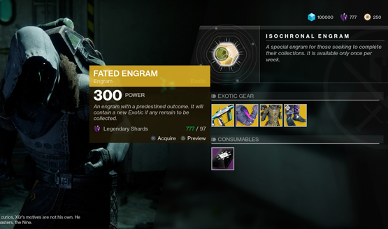 - Xur Changes – Xur will begin selling a fated Exotic Engram for Legendary Shards that will decrypt to an Exotic item that you don’t have yet. He will also start selling a Three-of-Coins that boosts Exotic drop rates for four hours.