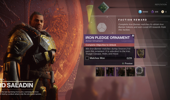- Armor Ornaments – Armor ornaments will be rewarded for completing various challenges associated with individual activities. They add additional customization on top of shaders and mods. Ornaments are permanently unlocked once earned, even if you delete and re-obtain pieces of armor. There will be ornaments in Season 2 for Iron Banner, Crucible, Vanguard, Faction, and more.
