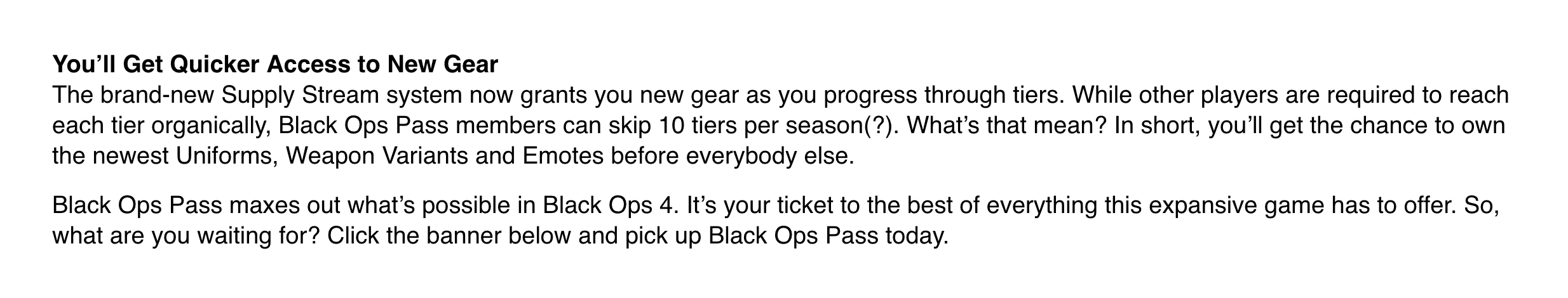 The brand-new Supply Stream system now grants you new gear as you progress through tiers. While other players are required to reach each tier organically, Black Ops Pass members can skip 10 tiers per season. What’s that mean? In short, you’ll get the chance to own the newest Uniforms, Weapon Variants and Emotes before everybody else.